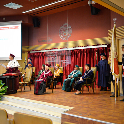 Dziękując za serdeczne słowa, życzenia i gratulacje rektor prof. Robert Tomanek uroczyście otwarł jubileuszowy rok akademicki 2016/2017 wypowiadając tradycyjną formułę "Quod bonum felix, faustum fortunatumque sit!" (Oby był szczęśliwy, sprzyjający i pomyślny) i trzykrotnie uderzając stopką berła.