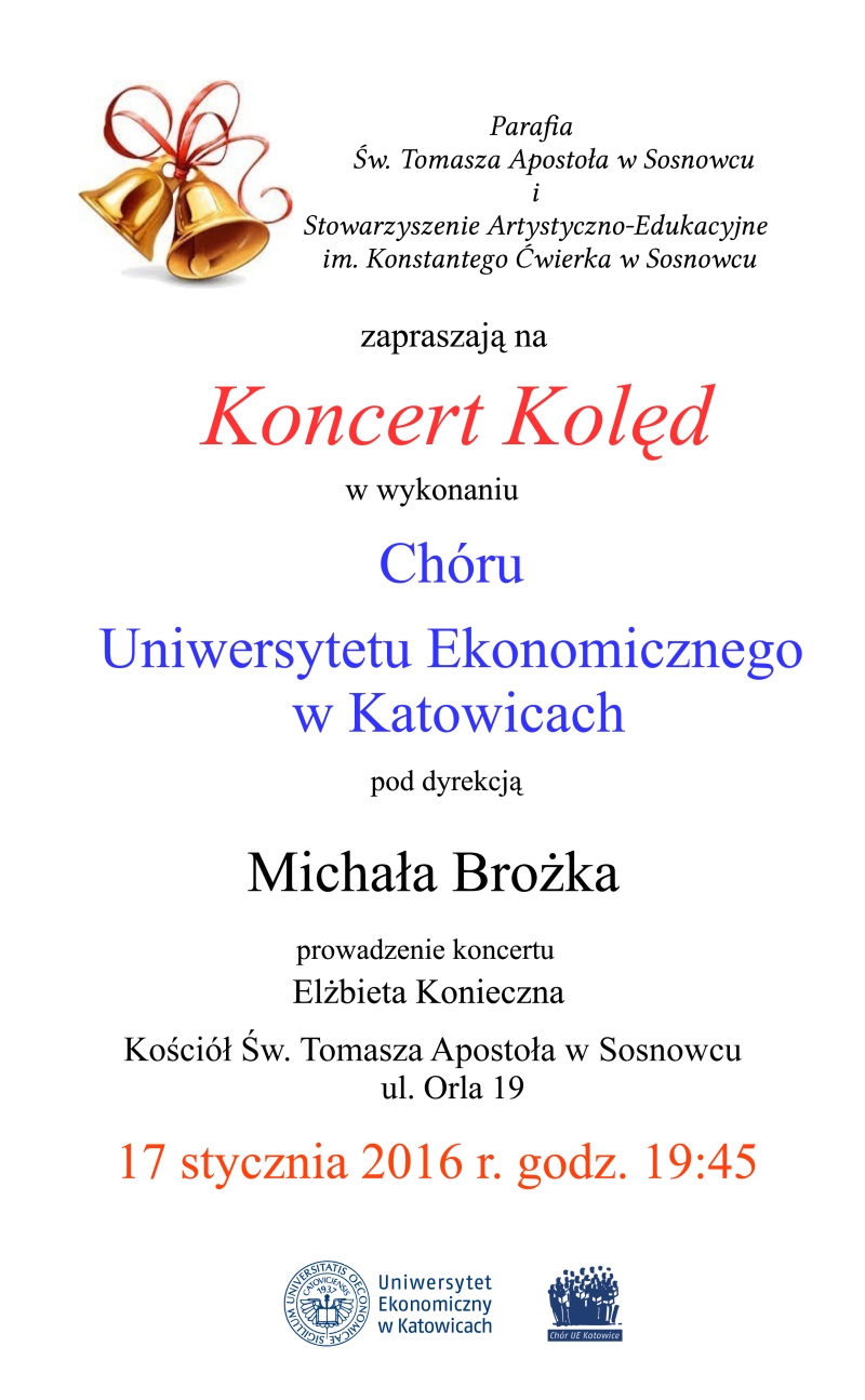 W niedzielę 17 stycznia 2016 r. o godz. 19.45 w kościele św. Tomasza Apostoła w Sosnowcu odbędzie się koncert kolęd w wykonaniu Chóru Uniwersytetu Ekonomicznego w Katowicach pod dyrekcją Michała Brożka.