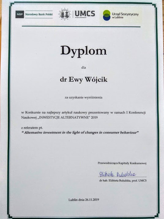 W dniach 26-27 listopada 2019 r. Pani Doktor wzięła udział w I Konferencji Naukowej "Inwestycje Alternatywne" 2019. Organizatorami byli: Wydział Ekonomiczny Uniwersytetu Marii Curie-Skłodowskiej w Lublinie, NBP o. w Lublinie oraz Urząd Statystyczny w Lublinie. Celem Konferencji była wymiana poglądów i doświadczeń naukowców oraz praktyków w zakresie szeroko rozumianego funkcjonowania rynku inwestycji alternatywnych. W spotkaniu udział wzięli ekonomiści, finansiści, inwestorzy oraz prawnicy.